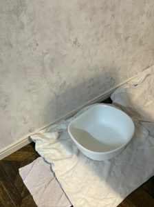 急いで桶をおいて床が水浸しになるのを防ぎました。