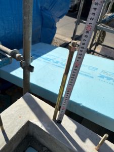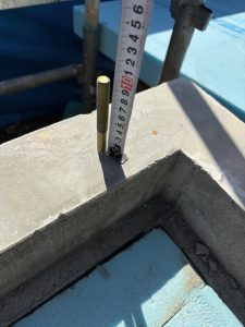 こちら!アンカーボルトです。図面通りの場所にあるか、基礎からの出は大丈夫かなどを確認します。